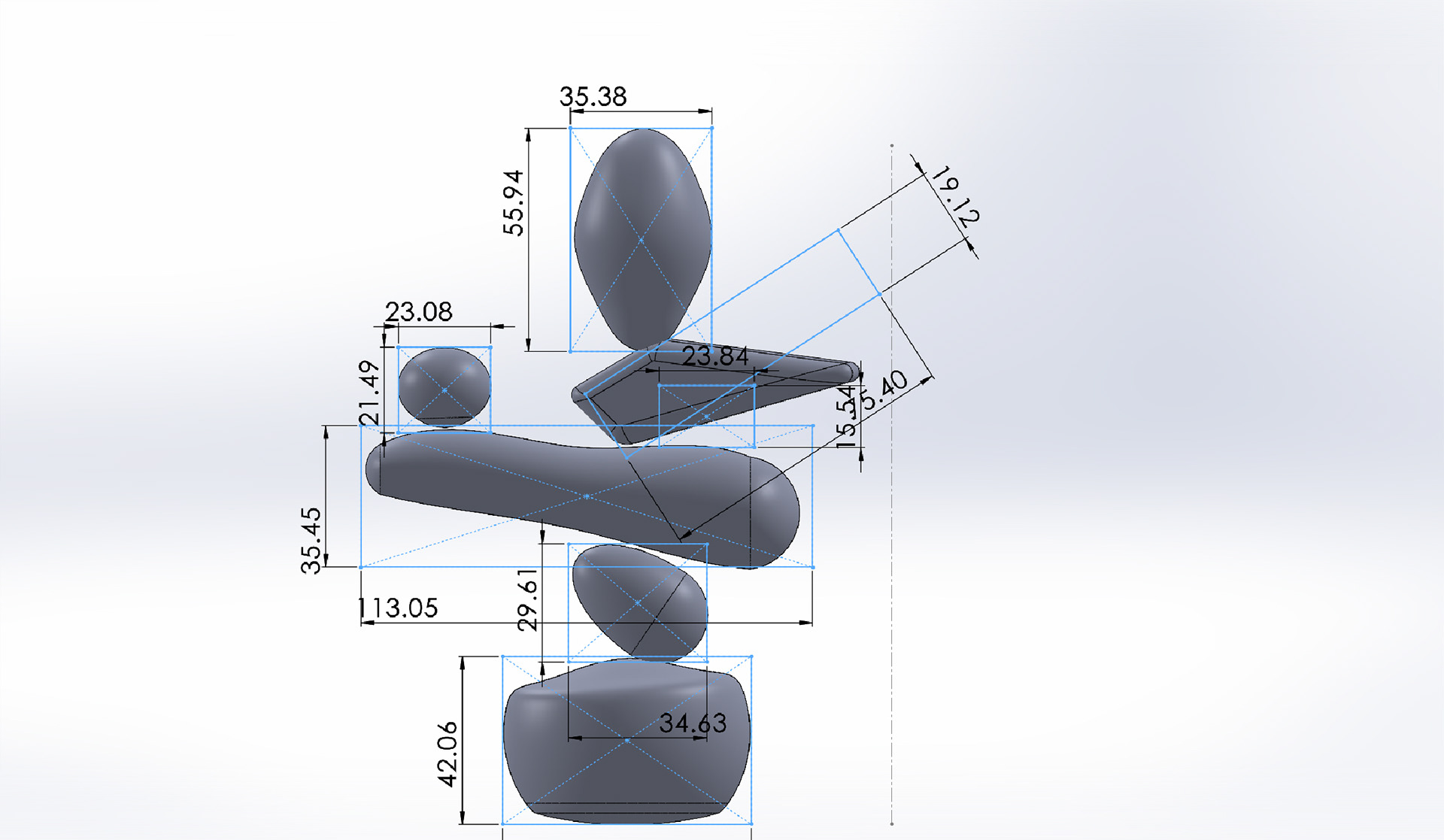 The 1:10 model was modeled using Solidworks equipped with the tools I needed for finding perfect balance. However, once I began working on the 1:1 model, I used my taichi skills. Just as I do when balancing rocks (see photo above)